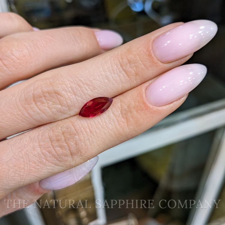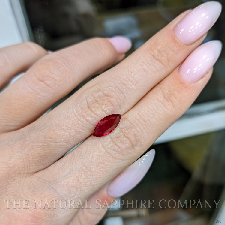 This exquisite ring from The Natural Ruby Company is the epitome of refined elegance and timeless symbolism. At its center, it features a stunning 2.04 carat marquise-shaped red ruby, its transparency enhancing its intrinsic beauty. The ruby measures 11.60 by 5.32 by 3.56 millimeters and is crafted with a mixed brilliant cut that enhances its ability to capture and reflect light. Its vivid color saturation radiates with every movement, a testament to its origin from the renowned gemstone mines of Burma, Myanmar. The clarity grade of very slightly included ensures that the gemstone maintains its captivating presence, with any inclusions being nearly imperceptible to the naked eye. An excellent polish further enhances the ruby's brilliance, making it an ideal representation of eternal love.