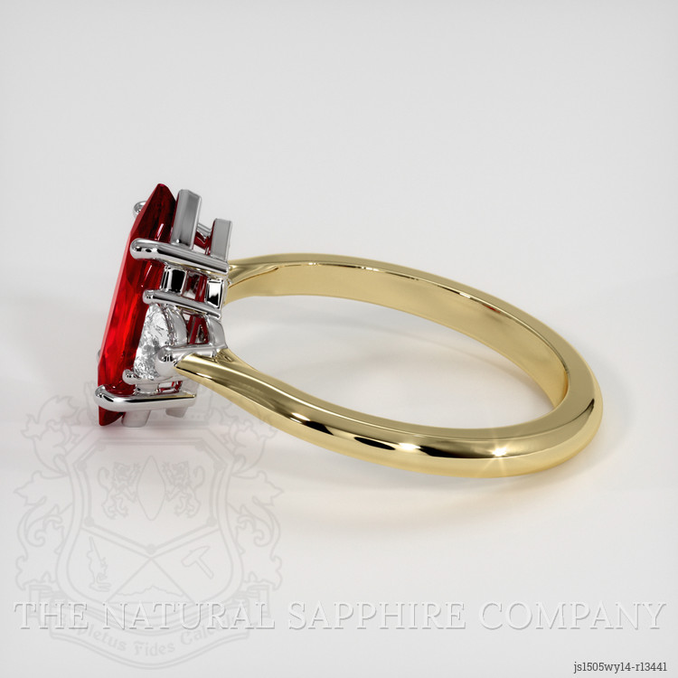 Accentuating this magnificent centerpiece are the elegantly poised white half-moon shaped diamonds. These gems, weighing approximately 0.30 carats, radiate with a clarity grade of Very Slightly Included (VS1, VS2). Their pristine E-grade color further elevates the ruby's vibrant hue, creating an enticing dance of light and brilliance. Each diamond has been conscientiously sourced, ensuring our commitment to ethical practices is reflected in every facet of this extraordinary piece.
