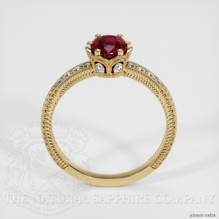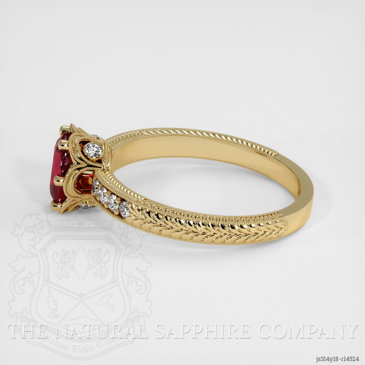 Along the shoulders and gallery, white round brilliant diamonds are integrated to complement the ruby. Larger accent diamonds are approximately 0.08 carat each, graded Very Slightly Included, with clarity grades noted as VS1 and VS2, and a color grade of F. Smaller accent diamonds are approximately 0.04 carat each, graded VS clarity with a color grade of F to G. These diamonds are bead set along the shoulders, with precise spacing and tight bead work to maintain optical continuity and minimize metal visibility. The setting displays delicate milgrain edgework along the band, a hallmark of meticulous finishing that softens light transition between metal and gemstone, and the overall polish and finish of the 14 karat yellow gold mounting provide warm reflection that intensifies the ruby’s hue without overpowering its saturation.