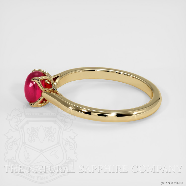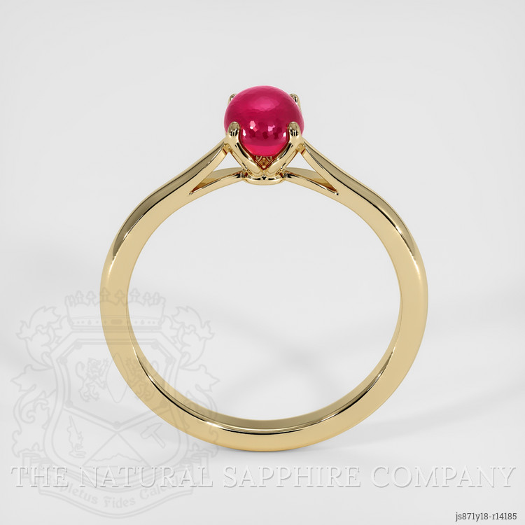 This ring centers a semi translucent 1.19 carat oval ruby, precisely measured at 6.18 by 4.92 by 3.45 mm, cut as a cabochon to emphasize the internal depth and smooth dome geometry, the cabochon profile is executed with consistent symmetry and an excellent polish that maximizes light transmission through the semitransparent body of the stone, eye level clarity is graded very slightly included, reflecting minor internal characteristics that do not detract from visual appeal, color exhibits intense saturation with a pure, vivid red hue that remains evenly distributed across the oval surface, the ruby is natural with no enhancement, origin Mozambique, the decision to retain the natural surface and polish of the cabochon highlights the stone collection history and allows the wearer to appreciate inherent mineral texture and light behavior, the gem is set in 14K yellow gold using a four claw crown that elevates the cabochon just enough to create a subtle gallery, the claws are tapered and polished to cradle the stone securely while allowing unobstructed viewing of the pavilion curve, the band is worked in a gently rounded profile that balances comfort and presence, finish is fully polished to a high reflectivity that complements the ruby saturation without competing with it, overall proportions were selected to maintain a low profile for daily wear while protecting the dome from direct impact, ruby hardness on the Mohs scale at 9 ensures practical durability for an active lifestyle, craftsmanship emphasizes clean junctions between prongs and shank, precise seat geometry, and microscopic finishing inside the gallery to reduce stress points and ensure long term stability.