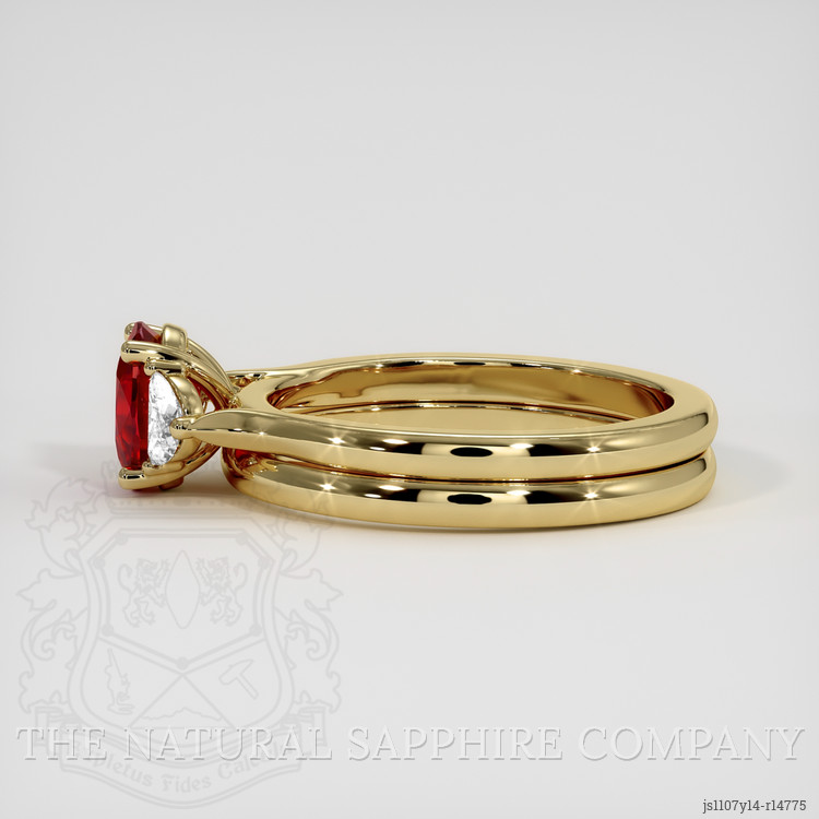 Flanking the central ruby are matched natural white half moon diamonds, selected to provide spectral contrast and to emphasize the ruby center without overpowering it. The total diamond weight is approximately 0.30 carats, and the stones are graded Very Slightly Included in clarity, specifically VS1 and VS2, combined with an E color grade that ensures a near colorless appearance against the warm metal. The half moon shape was chosen to complement the oval center, filling the shoulders of the setting and framing the main stone with clean geometry. Each diamond has been cut and polished to optimize light return and to maintain consistent scintillation next to the mixed brilliant ruby. The setting geometry positions the diamonds to balance the visual weight of the center stone, producing a coherent optical effect that highlights the ruby hue while maintaining overall refinement and symmetry.
