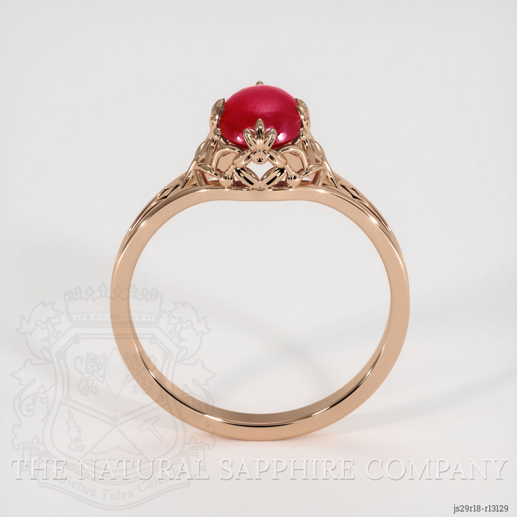 The ring's design draws inspiration from the serene grace of nature and the enduring strength of classic architecture. Set in luxurious 14K rose gold, the band mirrors the gentle curves and understated elegance found in harmonious natural landscapes. Like vines embracing a delicate flower, the intricate design flourishes around the lustrous stone, enhancing its beauty without overshadowing its natural allure. The soothing color of the rose gold complements the vibrant red of the ruby, creating a symphony of colors that echo the timeless dance of dusk and dawn.