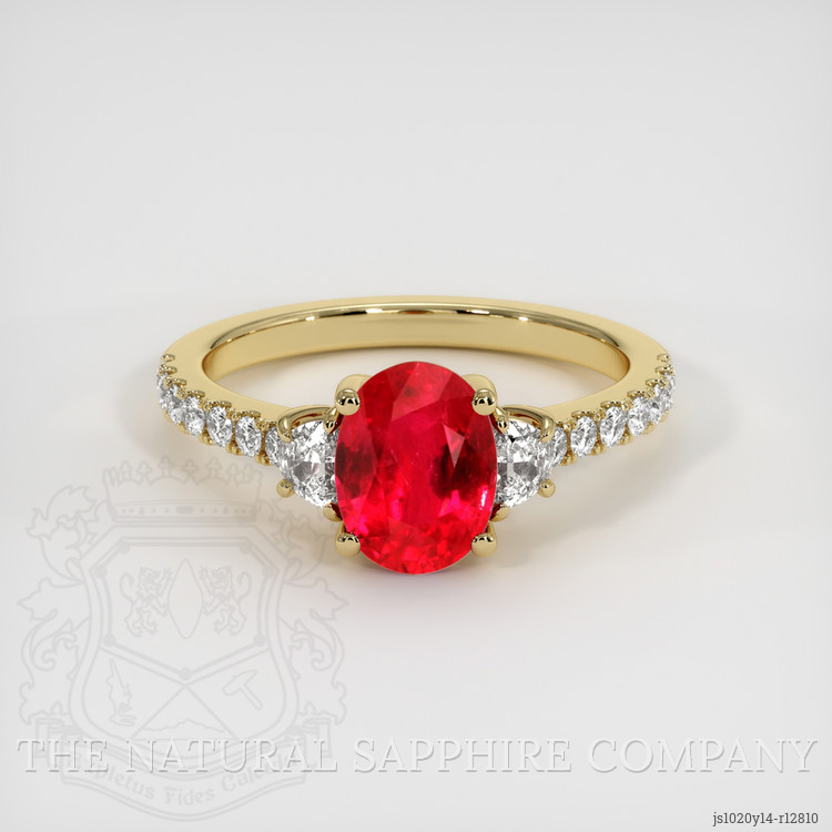 The ring features a beautiful, transparent 1.41 carat oval shape red ruby with the dimensions of 7.90 x 5.96 x 3.61 mm and a mixed brilliant cut. It has a clarity grade of very slightly included (evaluated at eye level), vivid color saturation, and an excellent polish. The origin of this ruby is Mozambique.