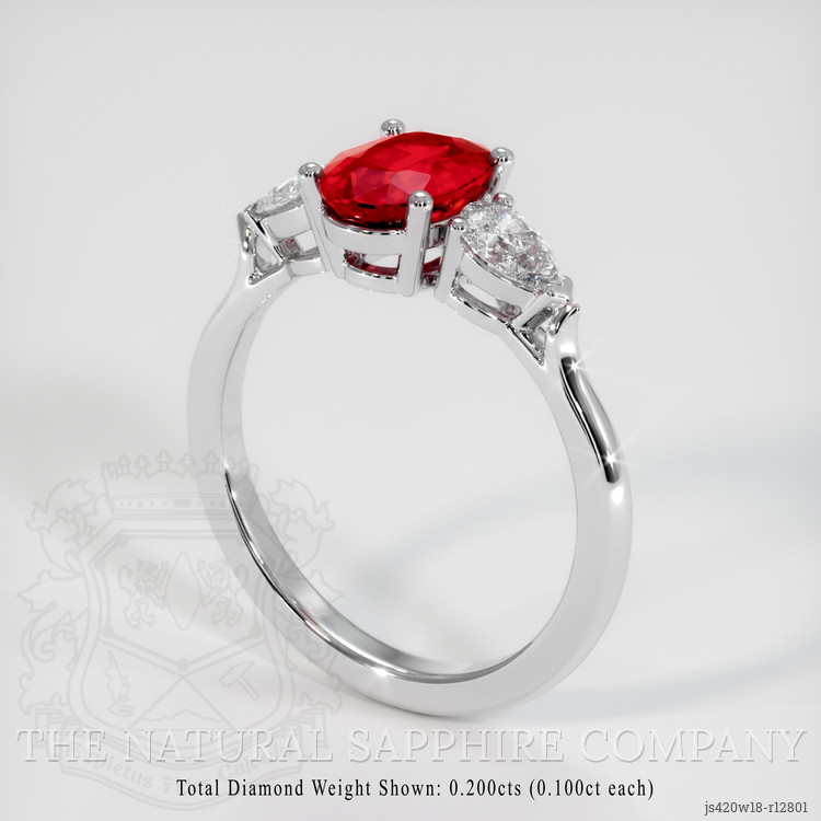 The ring features a beautiful, transparent 1.42 carat oval shape red ruby with the dimensions of 8.02 x 5.82 x 3.56 mm and a mixed brilliant cut. It has a clarity grade of slightly included (evaluated at eye level), vivid color saturation, and an excellent polish. The origin of this ruby is Mozambique.