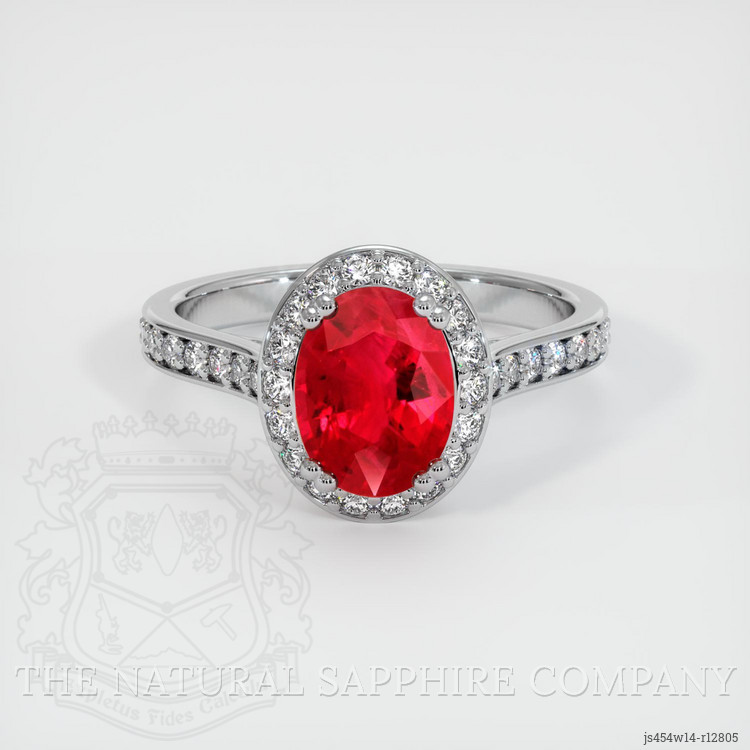 The ring features a beautiful, transparent 1.44 carat oval shape red ruby with the dimensions of 7.94 x 5.99 x 3.65 mm and a mixed brilliant cut. It has a clarity grade of very slightly included (evaluated at eye level), vivid color saturation, and an excellent polish. The origin of this ruby is Ceylon (Sri Lanka).