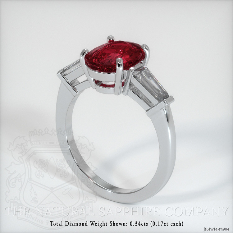 Also featured in the ring: White baguette (tapered) shaped diamonds, weighing approx 0.34 carats, clarity Very Slightly Included (VS1, VS2) and a color grade of E.