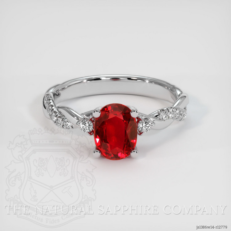 The ring features a beautiful, transparent GRS certified Vivid Red “Pigeon’s Blood” 2.12 carat oval shape red ruby with the dimensions of 8.14 x 6.22 x 4.21 mm and a mixed brilliant cut. It has a clarity grade of eye clean (evaluated at eye level), vivid color saturation, and an excellent polish. The origin of this ruby is Mozambique.