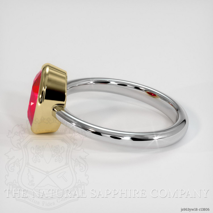 The ring itself is a masterpiece of design and craftsmanship, entirely set in a blend of 18K yellow gold and 18K white gold. The 18K yellow gold setting around the ruby not only secures the gemstone in place but also complements its rich red color. Conversely, the shank or band of the ring is crafted from 18K white gold, providing a sophisticated contrast that enhances the overall elegance of the piece. This duality of metals not only denotes luxury but also ensures durability and a long-lasting finish.