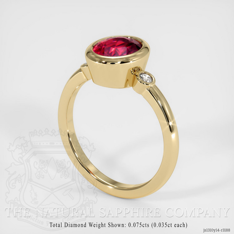 The ring features a beautiful, transparent GIA certified Red 2.31 carat oval shape red ruby with the dimensions of 8.24 x 6.81 x 5.25 mm and a modified brilliant cut. It has a clarity grade of slightly included (evaluated at eye level), vivid color saturation, and an excellent polish. The origin of this ruby is Tanzania.