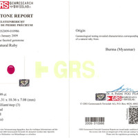 The ring features a beautiful, transparent GRS certified Red 7.99 carat oval shape red ruby with the dimensions of 12.30 x 10.36 x 7.08 mm and a mixed brilliant cut. It has a clarity grade of slightly included (evaluated at eye level), vivid color saturation, and an excellent polish. The origin of this ruby is Burma (Myanmar).