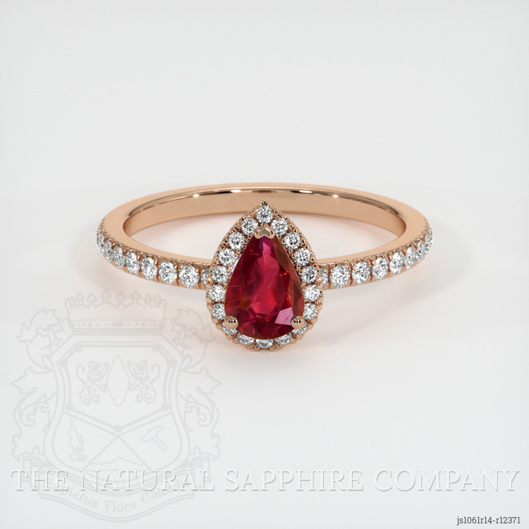 The ring features a beautiful, transparent 0.36 carat pear shape red ruby with the dimensions of 5.89 x 3.91 x 2.29 mm and a mixed brilliant cut. It has a clarity grade of very slightly included (evaluated at eye level), vivid color saturation, and an excellent polish. The origin of this ruby is Thailand (Siam).