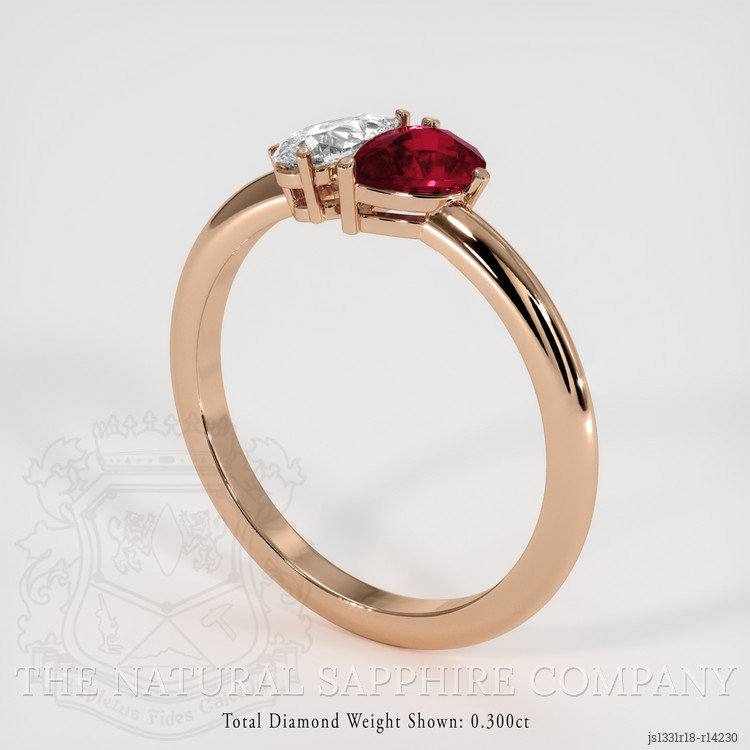 Paired alongside this fiery ruby is a magnificent white pear-shaped diamond, adding a touch of sophistication and grace. Weighing approximately 0.30 carats, the diamond boasts a clarity of VS1, VS2 and a dazzling E color grade. Together, the ruby and diamond form a harmonious blend of extraordinary beauty and radiant contrast. The diamonds catch the light like whispers of elegance and promise, telling stories of everlasting commitment and cherished moments. This combination of brilliance and fire sits beautifully on a setting of 14K rose gold, adding a warm and romantic glow to the entire piece.