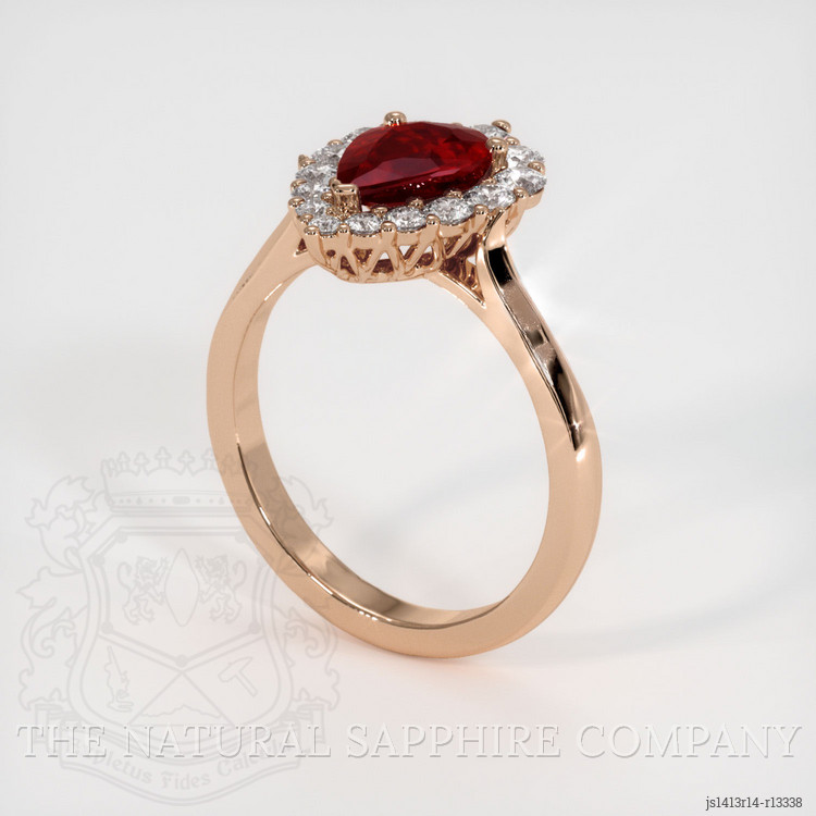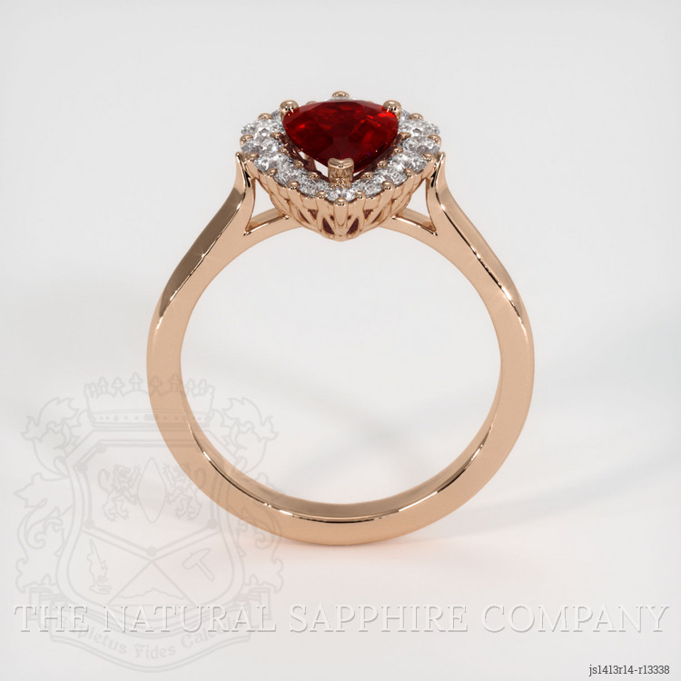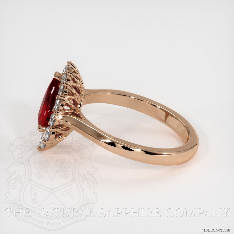 This ruby is meticulously set in a 14K Rose Gold setting, style number JS1413, which has been crafted to embrace the ruby in a display of pure artistry. Complementing the centerpiece are diamond accents, with each stone carefully chosen to harmonize with the ruby's natural luster. These diamonds, each a testament to nature's perfection, are as follows: one at 0.06 carats, two at 0.08 carats, another at 0.071 carats, and additional stones weighing 0.07, 0.06, 0.05, and 0.04 carats respectively, culminating with one more at 0.015 carats. All diamonds share a pave grade of F, reflecting their top-tier quality, and are round in shape, set to enhance the brilliance of the ring with every movement.