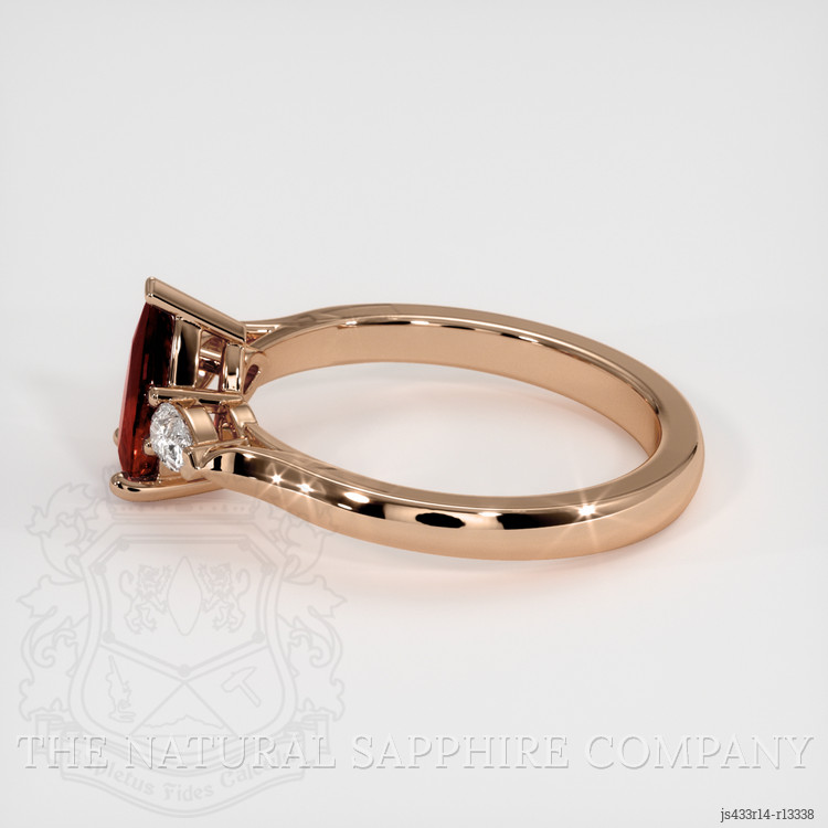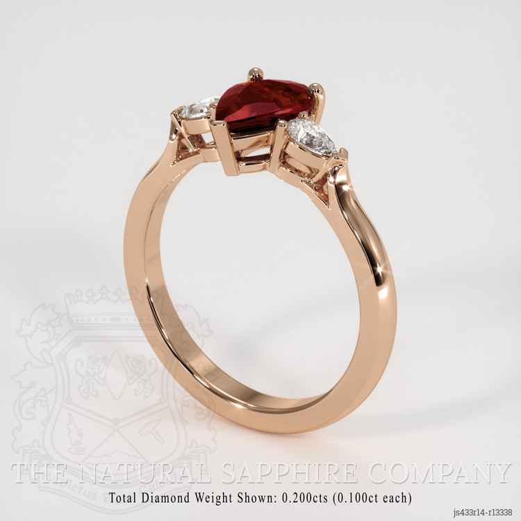 The ring features a beautiful, transparent 1.01 carat pear shape red ruby with the dimensions of 8.29 x 5.47 x 2.97 mm and a mixed brilliant cut. It has a clarity grade of very slightly included (evaluated at eye level), vivid color saturation, and an excellent polish. The origin of this ruby is Mozambique.