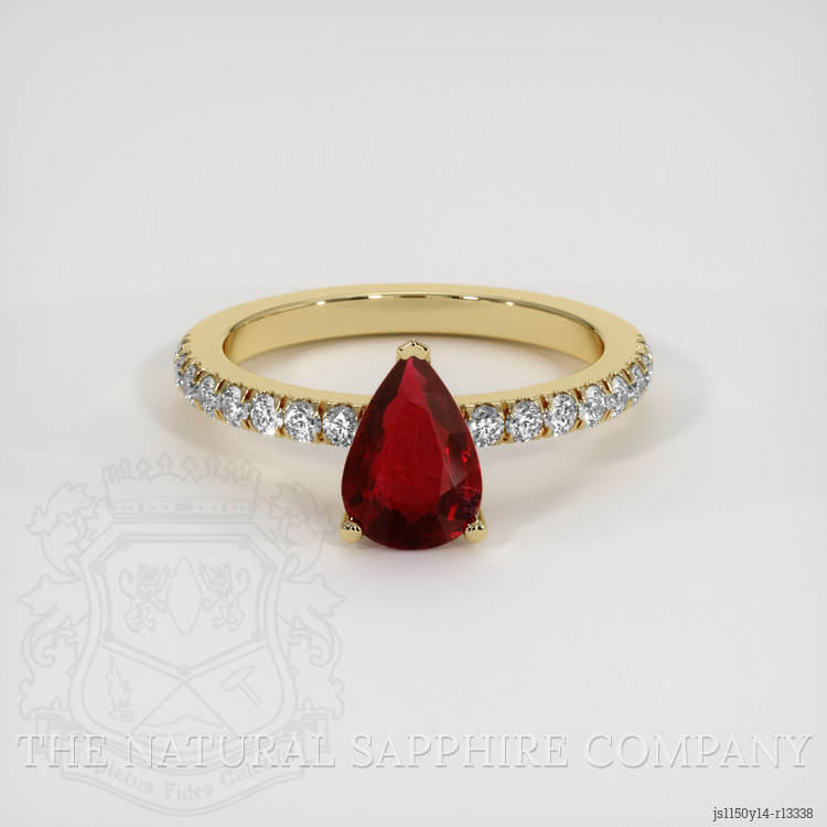 Introducing a masterpiece of elegance and charm, this exquisite ring is far more than a simple adornment. It is a rare treasure, crafted for the discerning few who value exceptional beauty and the artistry of gemstones. At the heart of this creation lies a captivating 1.01 carat pear-shaped red ruby, sourced meticulously from the lush lands of Mozambique. Its dimensions, 8.29 x 5.47 x 2.97 mm, reveal a harmonious form, and the mixed brilliant cut bestows upon it a dazzling play of light. With excellent polish and a vivid color saturation, this ruby is astonishingly pure, free from enhancement, whispering stories of authenticity with every glimmer.