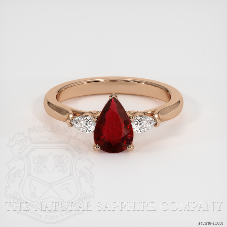 The ring features a beautiful, transparent 1.01 carat pear shape red ruby with the dimensions of 8.29 x 5.47 x 2.97 mm and a mixed brilliant cut. It has a clarity grade of very slightly included (evaluated at eye level), vivid color saturation, and an excellent polish. The origin of this ruby is Mozambique.