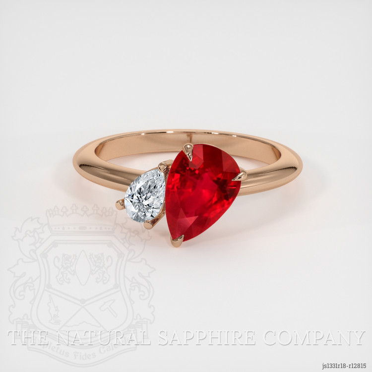 The ring features a beautiful, transparent 1.31 carat pear shape red ruby with the dimensions of 8.39 x 5.76 x 3.63 mm and a mixed brilliant cut. It has a clarity grade of eye clean (evaluated at eye level), vivid color saturation, and an excellent polish. The origin of this ruby is Mozambique.