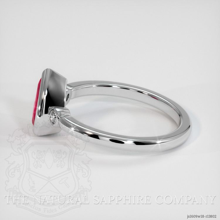 Surrounding this captivating ruby, the ring's setting in 18K white gold mirrors its purity and elegance, providing a perfect canvas for customization. The gleam of white gold is punctuated by two enchanting round-shaped diamonds, weighing approximately 0.04 carats collectively. These diamonds, with their superior clarity of VS1 and VS2 grades and a color grade of F, stand as a testament to timeless beauty and grace. Such a combination ensures the ring not only speaks to the heart but also exemplifies sophistication and prestige. The subtle brilliance of these diamonds enhances the ruby's fiery core, offering not just visual delight but an emotional connect that forever binds it to your personal tale.