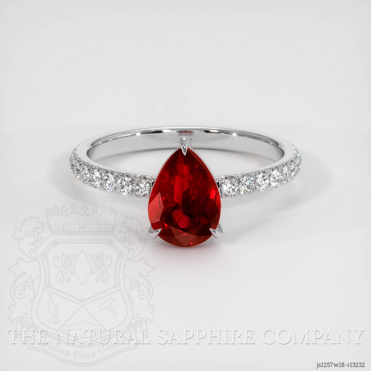 The ring features a beautiful, transparent GIA certified Red 1.55 carat pear shape red ruby with the dimensions of 8.44 x 6.00 x 3.77 mm and a mixed brilliant cut. It has a clarity grade of very slightly included (evaluated at eye level), vivid color saturation, and an excellent polish. The origin of this ruby is Mozambique.