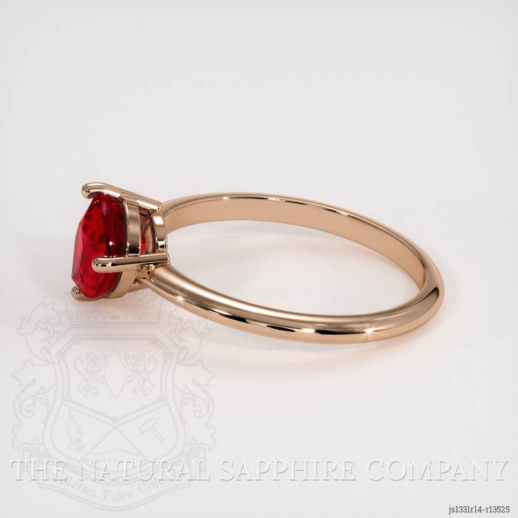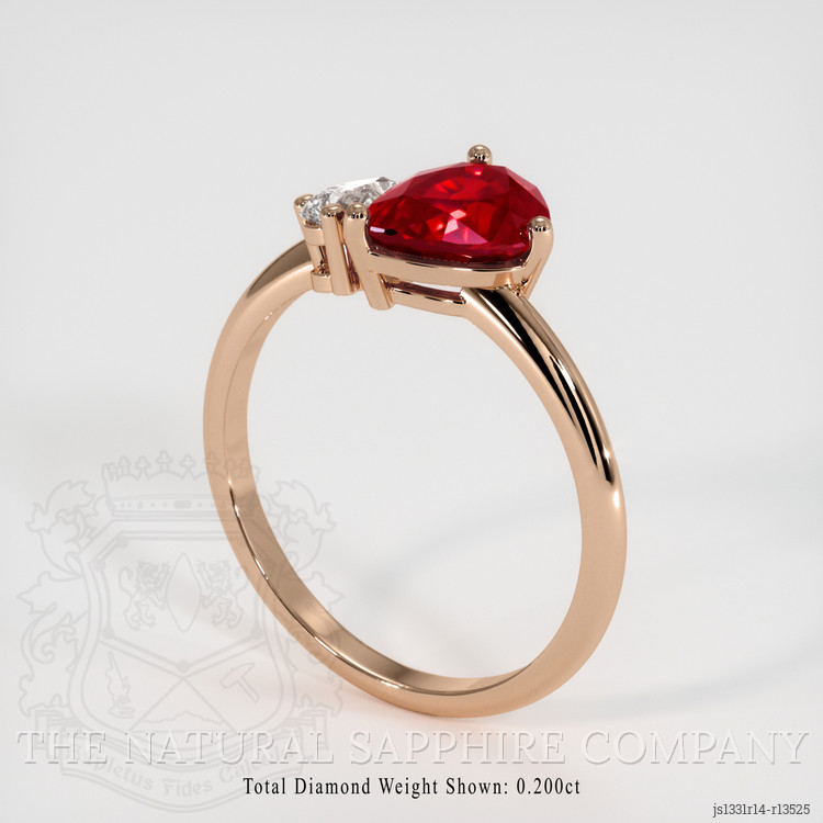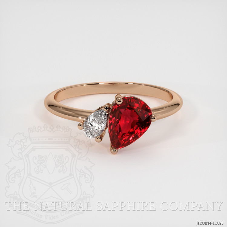 The ring features a beautiful, transparent 1.66 carat pear shape red ruby with the dimensions of 7.93 x 6.03 x 4.38 mm and a mixed brilliant cut. It has a clarity grade of eye clean (evaluated at eye level), vivid color saturation, and an excellent polish. The origin of this ruby is Mozambique.