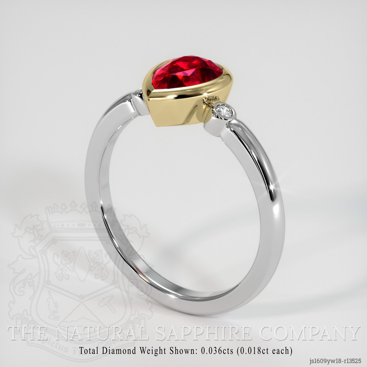 Accompanying the ruby are two white round-shaped diamonds, each weighing approximately 0.036 carats. These diamonds possess a clarity grade of Very Slightly Included (VS1, VS2), ensuring minimal inclusions that are not visible to the naked eye. The color grade of these diamonds is F, pointing to an absence of color that enhances the overall brilliance of the stones. Together, these diamonds add a touch of sparkle, complementing the deep, rich hue of the ruby and providing a harmonious balance to the design.