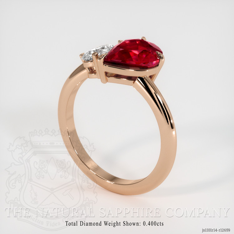 The ring features a beautiful, transparent GRS certified Vivid Red “Pigeon’s Blood” 2.04 carat pear shape red ruby with the dimensions of 9.45 x 6.54 x 4.38 mm and a mixed brilliant cut. It has a clarity grade of eye clean (evaluated at eye level), vivid color saturation, and an excellent polish. The origin of this ruby is Mozambique.