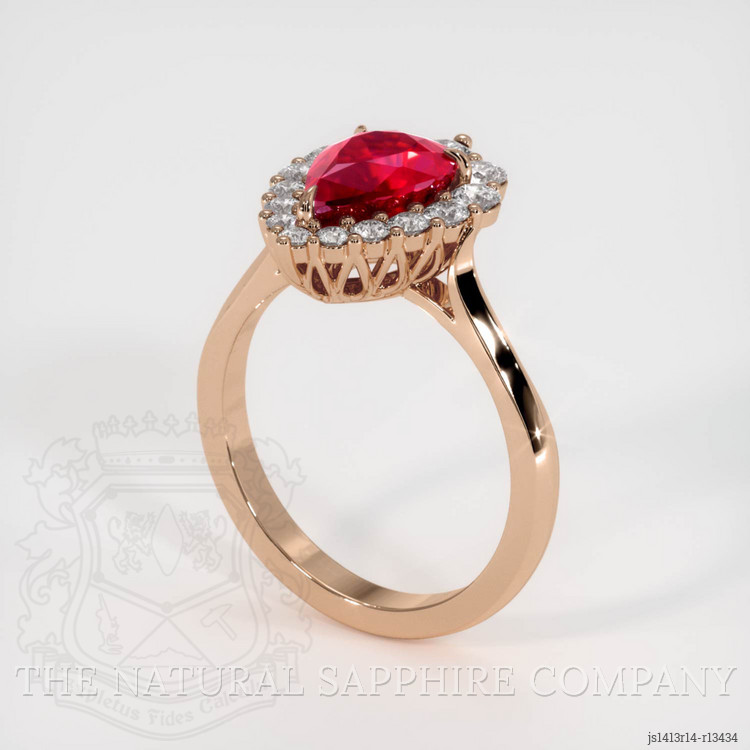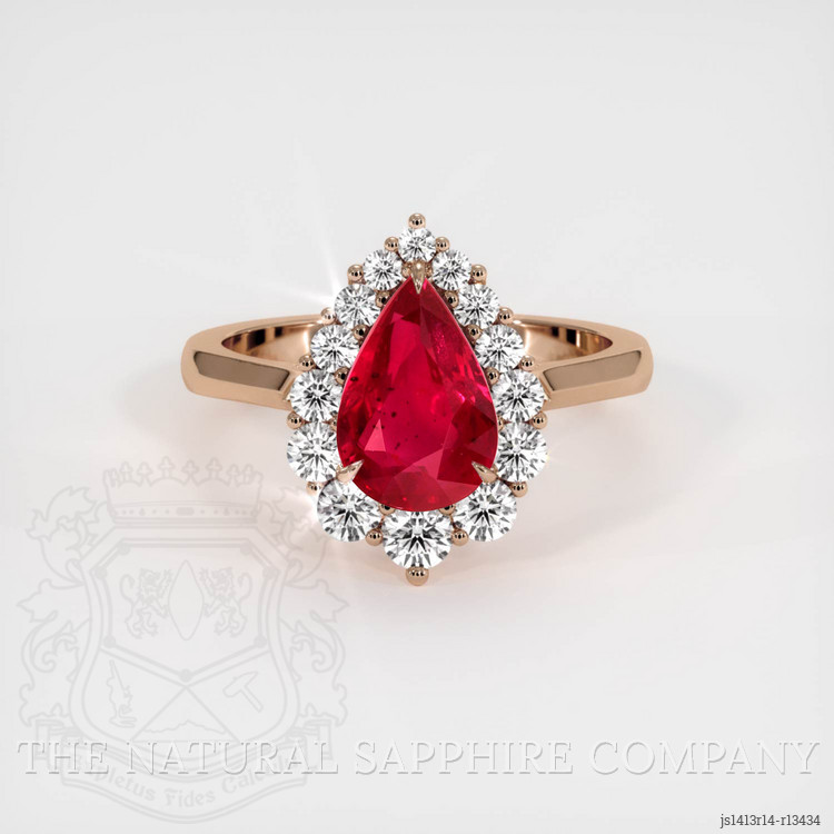 The ring features a beautiful, transparent GIA certified Red 2.04 carat pear shape red ruby with the dimensions of 9.71 x 6.45 x 3.99 mm and a mixed brilliant cut. It has a clarity grade of slightly included (evaluated at eye level), intense color saturation, and an excellent polish. The origin of this ruby is Mozambique.