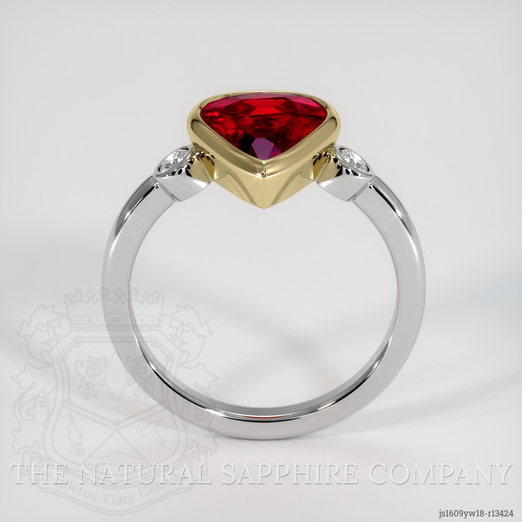 Alongside this majestic ruby, two finely selected white diamonds lend an additional touch of sophistication and brilliance. Weighing approximately 0.09 carats in total, and boasting a clarity grade of VS1 and VS2, these diamonds complement the ruby while upholding the mysterious depth and rarity of their own allure. With a color grade of F, their exceptional whiteness is a perfect match for the captivating hue of the ruby, crafting a harmonized elegance that speaks to the purity and depth of a committed relationship.
