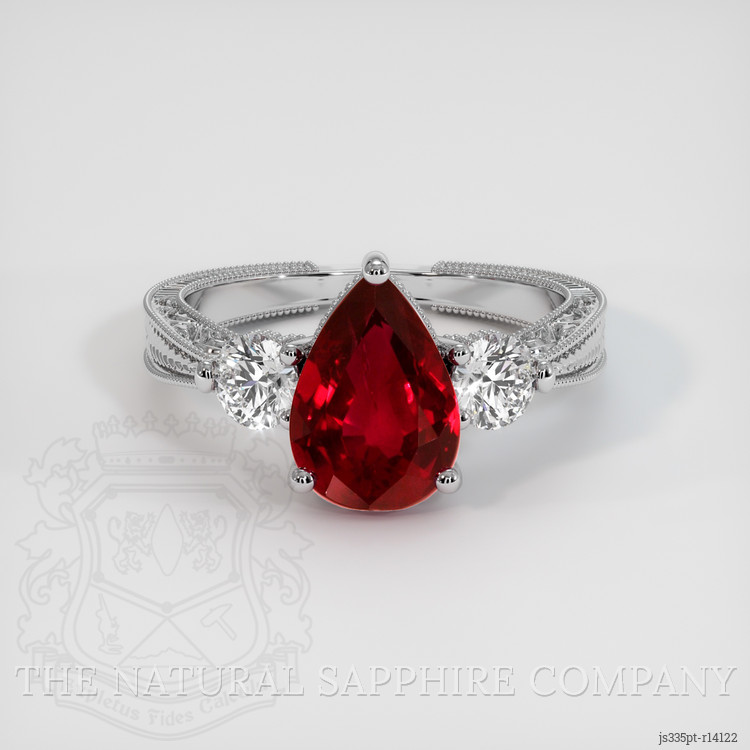 Introducing an extraordinary piece from The Natural Ruby Company, a ring that perfectly marries the sophistication of elegance with the practical facets of functionality. At the heart of this exquisite piece lies a rare treasure—the GRS certified Vivid Red “Pigeon’s Blood” ruby, weighing an impressive 2.32 carats. This extraordinary gemstone, with dimensions of 10.20 x 6.98 x 4.26 mm, captivates with its mesmerizing pear shape and mixed brilliant cut. Its vivid color saturation, only slightly included when restrained to the keenest of observations, graces it with an unrivaled brilliance. Sourced from the esteemed mines of Mozambique, this ruby ensures that you are not merely wearing a piece of jewelry, but bearing witness to nature’s artwork—rare, precious, and exclusive.