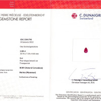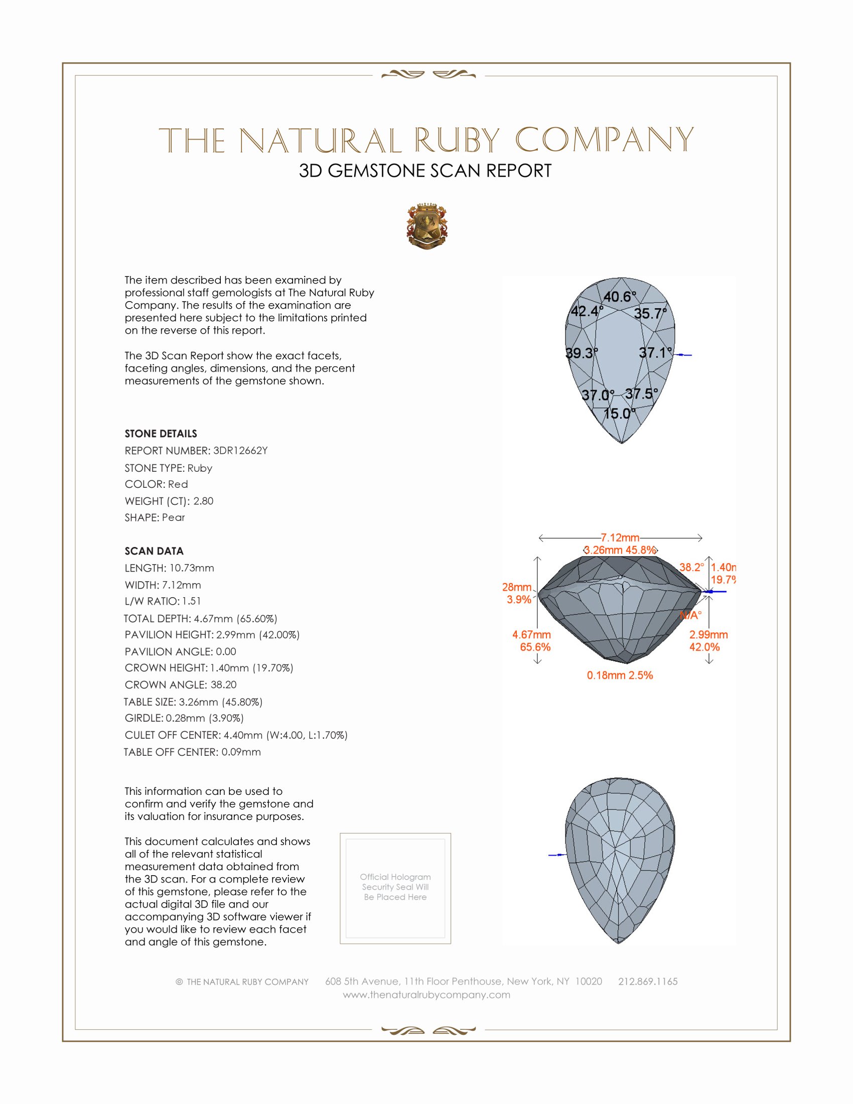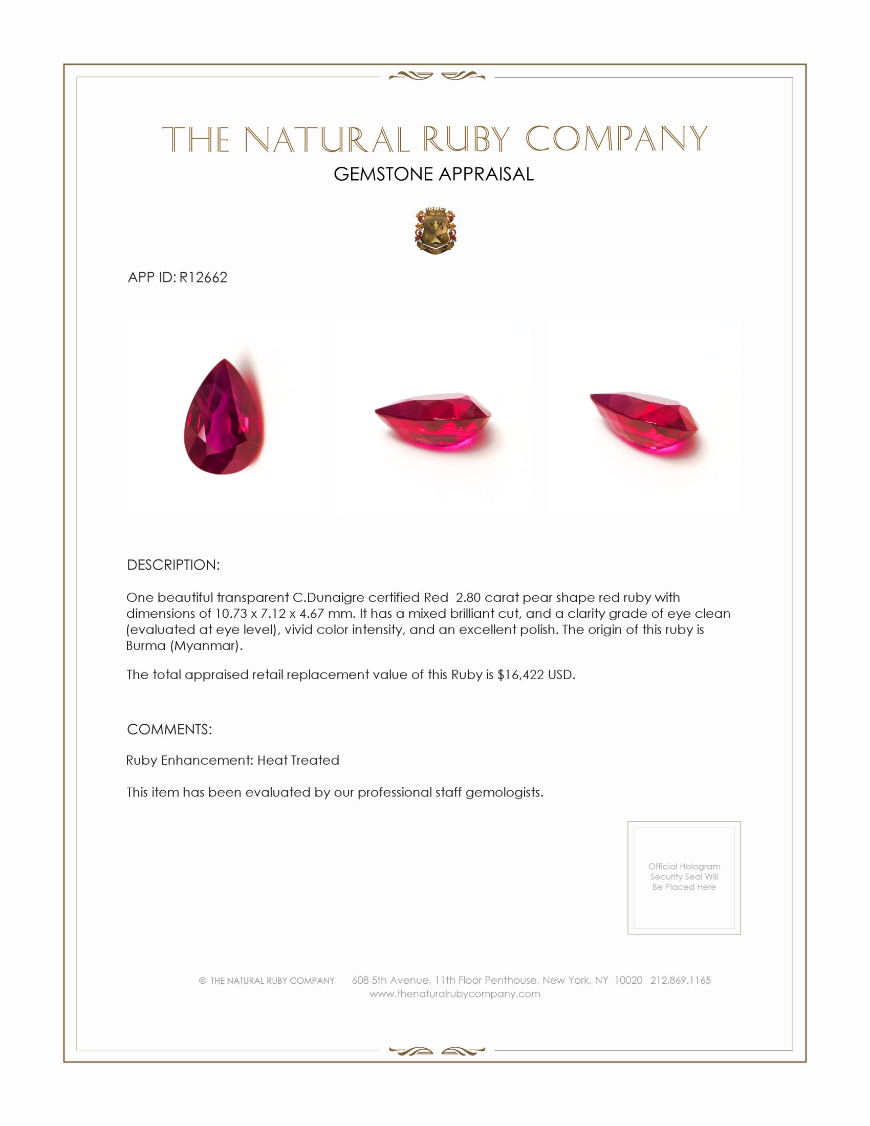 The ring features a beautiful, transparent C.Dunaigre certified Red 2.80 carat pear shape red ruby with the dimensions of 10.73 x 7.12 x 4.67 mm and a mixed brilliant cut. It has a clarity grade of eye clean (evaluated at eye level), vivid color saturation, and an excellent polish. The origin of this ruby is Burma (Myanmar).