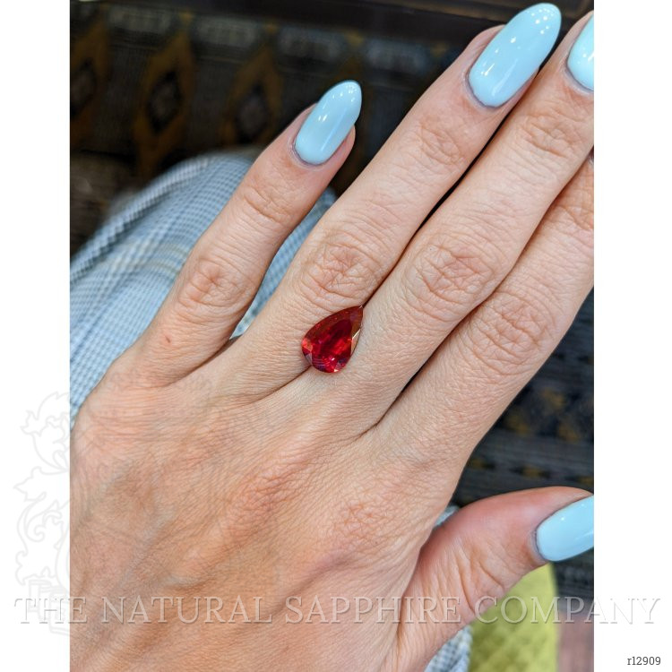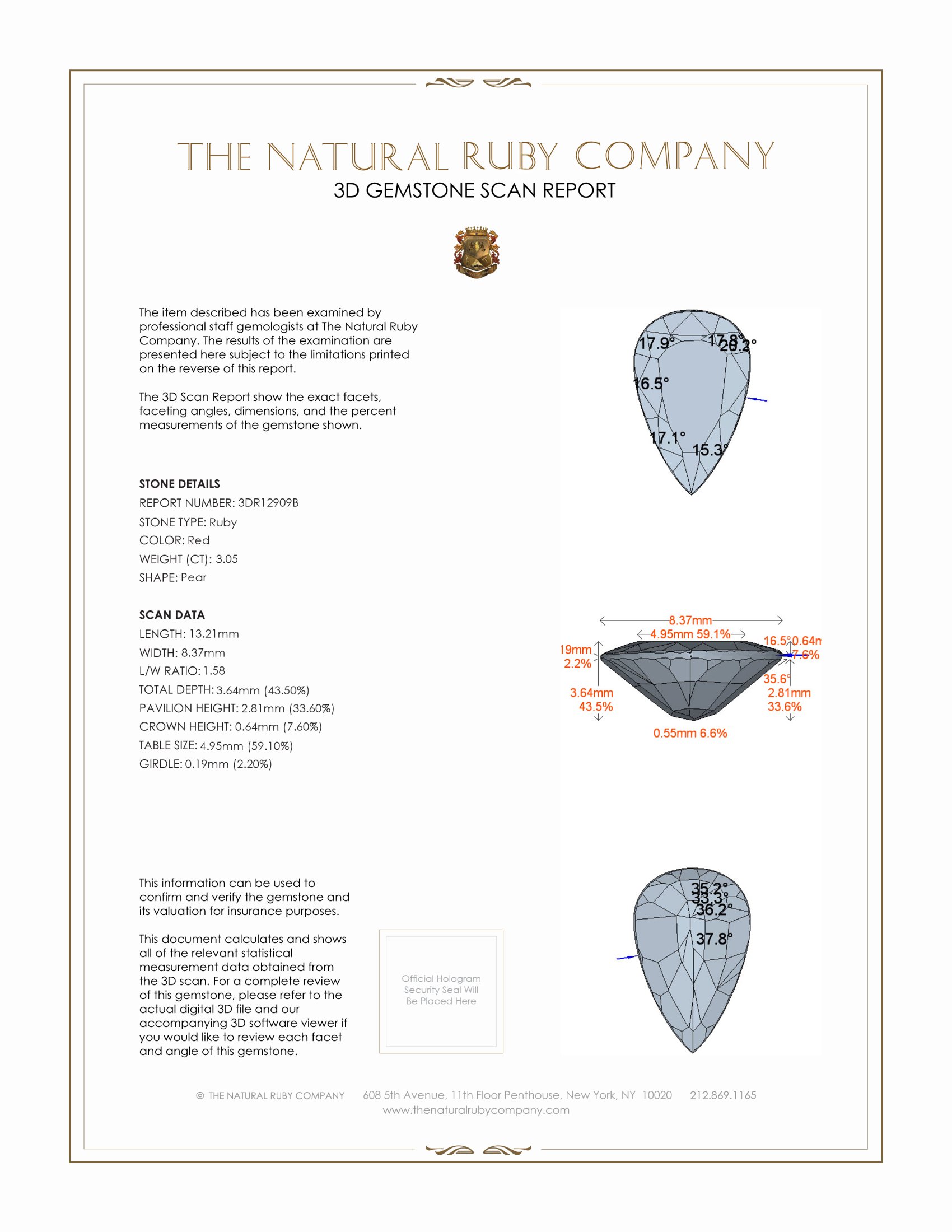 The ring features a beautiful, transparent C.Dunaigre certified Vivid Red “Pigeon’s Blood” 3.05 carat pear shape red ruby with the dimensions of 13.21 x 8.37 x 3.64 mm and a mixed brilliant cut. It has a clarity grade of eye clean (evaluated at eye level), vivid color saturation, and an excellent polish. The origin of this ruby is Mozambique.