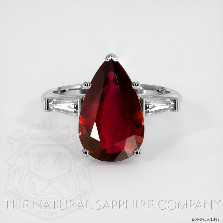 The ring features a beautiful, transparent GRS certified Vivid Red “Pigeon’s Blood” 3.18 carat pear shape red ruby with the dimensions of 13.07 x 8.12 x 3.50 mm and a mixed brilliant cut. It has a clarity grade of very slightly included (evaluated at eye level), vivid color saturation, and an excellent polish. The origin of this ruby is Mozambique.