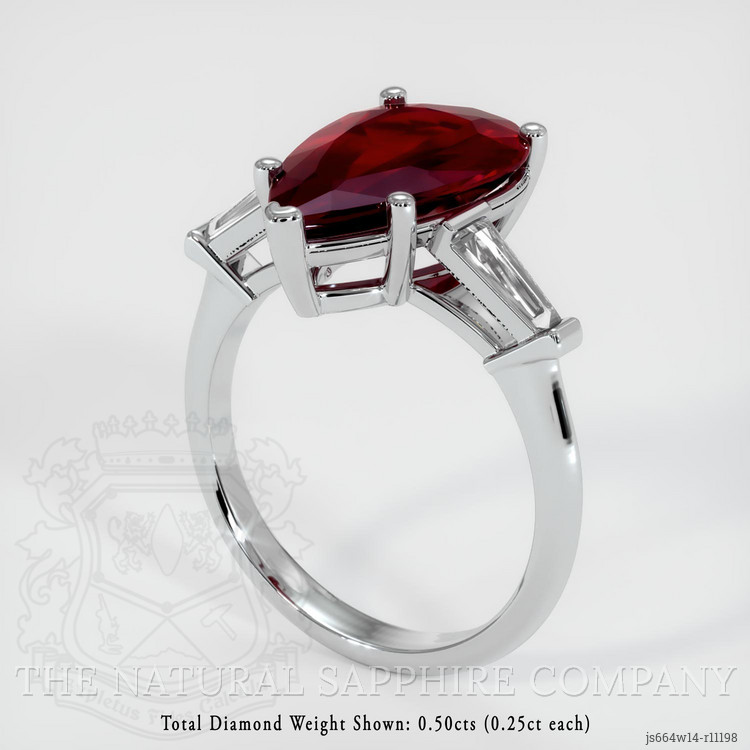 Also featured in the ring: White baguette (tapered) shaped diamonds, weighing approx 0.50 carats, clarity Very Slightly Included (VS1, VS2) and a color grade of E.