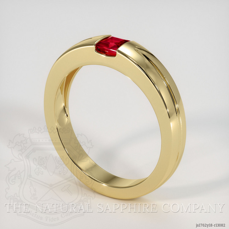 In the gentle glow of twilight, where dreams weave themselves into reality, lies an emblem of eternal promise, a men's ring that captures the essence of devotion in its gleaming heart. Set in the warm embrace of 18K yellow gold, this exquisite band holds a spectacular princess-shaped red ruby, a gem that whispers of love as timeless as the stars above. With its intense color saturation, the ruby sparkles with a fiery spirit, echoing the vibrancy of undying passion.
