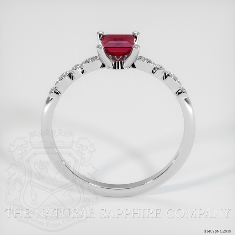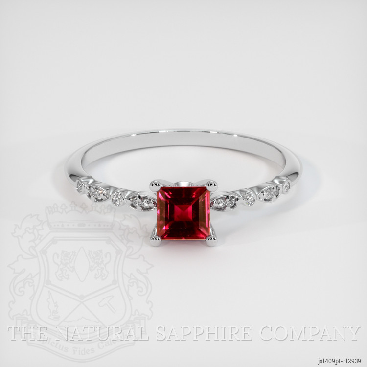 The ring features a beautiful, transparent 0.40 carat princess shape red ruby with the dimensions of 4.04 x 4.03 x 2.50 mm and a princess cut. It has a clarity grade of very slightly included (evaluated at eye level), intense color saturation, and an excellent polish. The origin of this ruby is Mozambique.