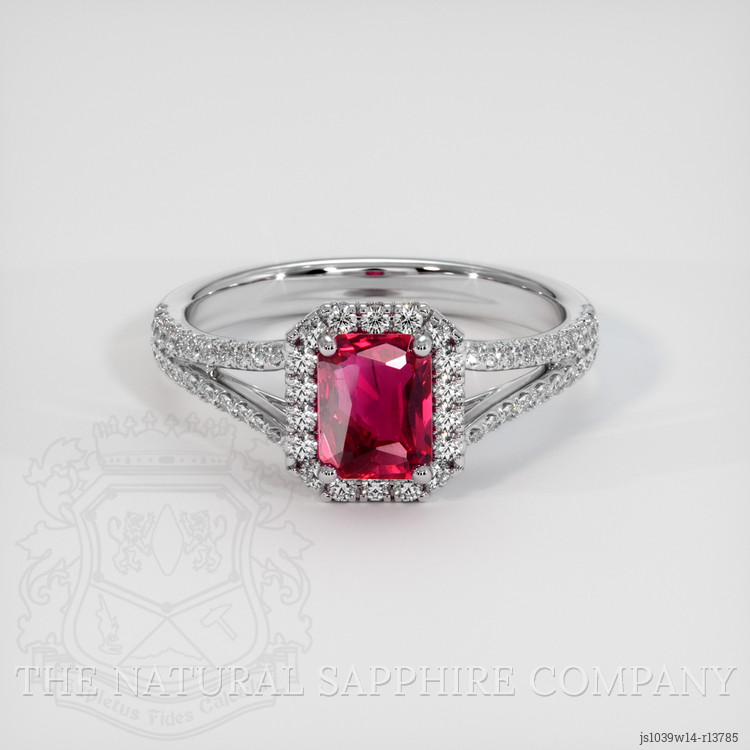 The entirety of the ring is set in lustrous 14K white gold. The choice of white gold not only serves as a stunning background to the colorful gemstone but also enhances the overall clarity and brightness of the design. The setting is designed with precision to ensure that each facet of the ruby interacts optimally with light, highlighting the gemstone's pristine polish and intense saturation. The craftsmanship and configuration of the diamonds create a harmonious ensemble, drawing the viewer’s eye to the captivating centerpiece while ensuring the ring’s structural integrity and timeless elegance.