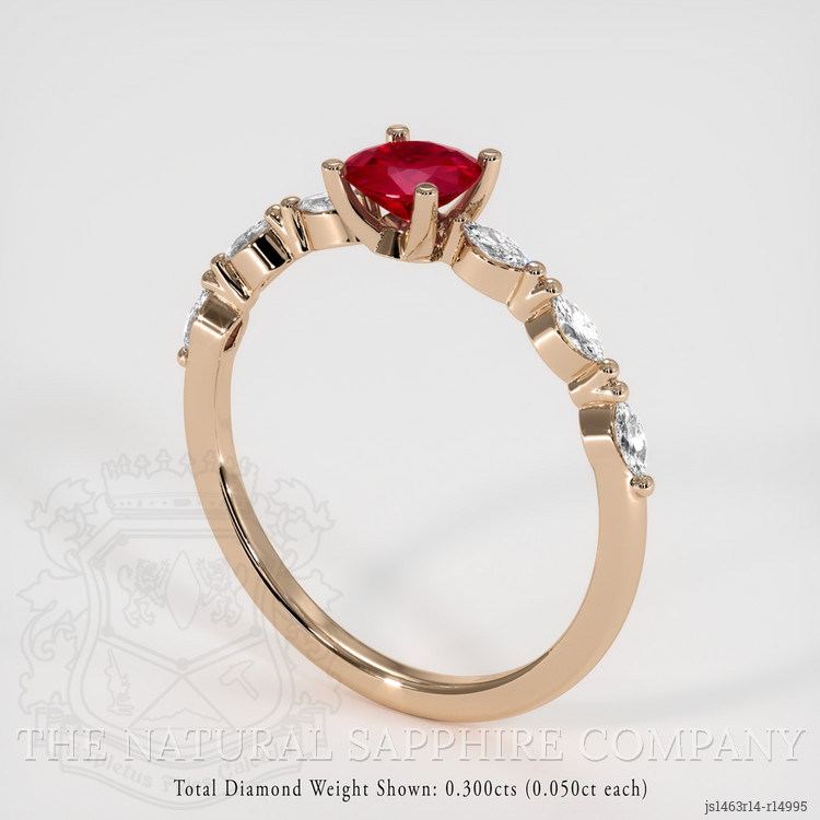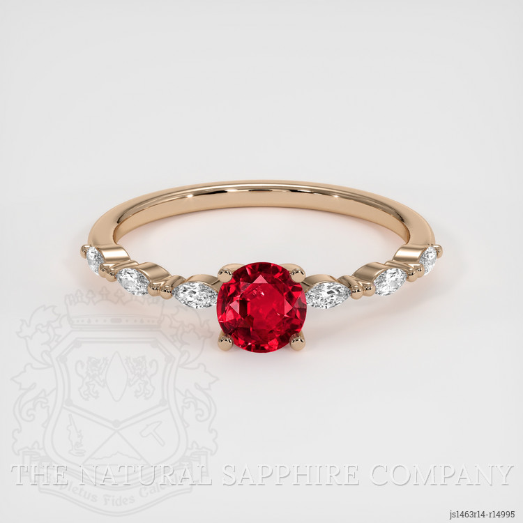 The centerpiece of this ring is a luminous 0.45 carat round Mozambique ruby, measuring 4.93 by 4.88 by 2.43 mm, cut in a mixed brilliant style that maximizes fire and depth of color, with a clarity grade of slightly included as evaluated at eye level, vivid color saturation, and an excellent polish. Enhanced by heat treatment to stabilize and intensify its red, this ruby glows with a pure, regal hue that sits beautifully upon an 18K rose gold band, the warm metal enhancing the gemstone’s vividness. Flanking the ruby, white marquise shaped natural diamonds totaling approximately 0.30 carats, clarity Very Slightly Included VS1 and VS2, color grade F, are set in a graduated sequence to create elegant movement and a refined shimmer along the shoulders of the ring. Each element is composed and finished with the exacting standards you expect from The Natural Ruby Company, a piece that reads as both heirloom and bold statement.