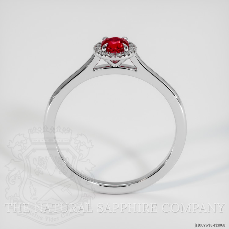 A rare study in refinement, this ring centers a transparent 0.47 carat round Mozambique ruby, its 4.37 x 4.32 x 3.06 mm proportions cut in a mixed brilliant profile to maximize fire and depth, its vivid color saturation drawing the eye with an almost magnetic intensity. Evaluated as slightly included at eye level, with an excellent polish, this heat treated treasure sits crowned by a delicate halo of white round natural diamonds totaling approximately 0.098 carats, their VS clarity and F G color creating a luminous frame that amplifies the ruby's glow. The entire composition is rendered in 14K white gold, the cool metal elevating the ruby's red to a modern and elegant statement, the slim band and subtle gallery designed to focus attention on the center stone while offering everyday comfort and enduring style. From the precision of the mixed brilliant cut to the meticulous setting of the diamond accents, every element speaks to discerning taste and to the quiet distinction that comes with owning a piece from The Natural Ruby Company.