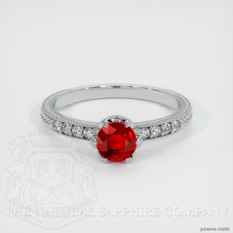 The ring features a beautiful, transparent 0.68 carat round shape red ruby with the dimensions of 5.13 x 5.08 x 3.13 mm and a brilliant cut. It has a clarity grade of very slightly included (evaluated at eye level), vivid color saturation, and an excellent polish. Enhancement: heat treated. The origin of this ruby is Mozambique.