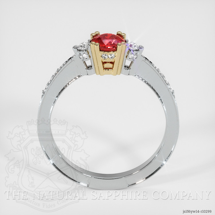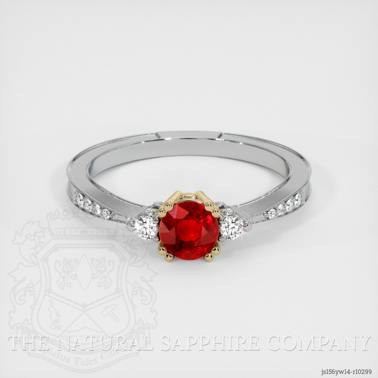 The ring features a beautiful, transparent 0.69 carat round shape red ruby with the dimensions of 4.86 x 4.87 x 3.34 mm and a brilliant cut. It has a clarity grade of very slightly included (evaluated at eye level), vivid color saturation, and an excellent polish. The origin of this ruby is Mozambique.