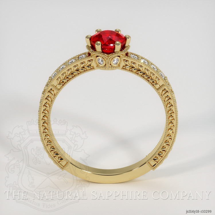 The ring boasts a striking design featuring a transparent 0.77 carat round ruby with dimensions of 4.99 x 4.97 x 3.77 mm and a brilliant cut. The ruby exhibits vivid color saturation and an excellent polish while maintaining a clarity grade of very slightly included as evaluated at eye level. Originating from Mozambique, this gemstone is complemented by the setting it resides in. The band, crafted entirely in 18K yellow gold, is designed for comfort and is suitable for all-day wear. Accompanying the ruby, the ring includes white round-shaped diamonds weighing approximately 0.06 carats and 0.03 carats respectively. These diamonds possess a clarity range of VS1 to VS2 and a color grade of F, ensuring a harmonious complement to the central ruby. The professional craftsmanship focuses on enhancing the wearer's experience through meticulous attention to quality and detail.