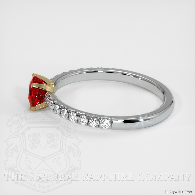The ring features a beautiful, transparent 0.77 carat round shape red ruby with the dimensions of 4.99 x 4.97 x 3.77 mm and a brilliant cut. It has a clarity grade of very slightly included (evaluated at eye level), vivid color saturation, and an excellent polish. The origin of this ruby is Mozambique.