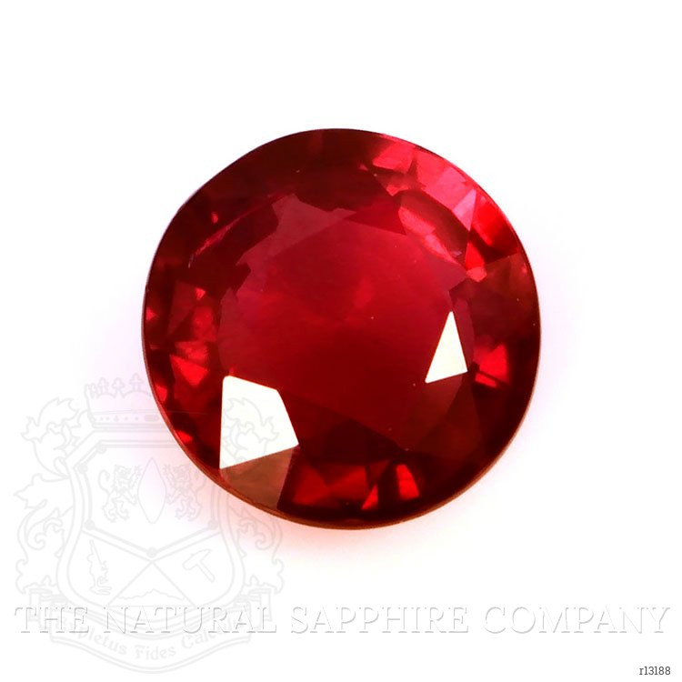 The ring features a beautiful, transparent 0.68 carat round shape red ruby with the dimensions of 5.22 x 5.11 x 2.79 mm and a mixed brilliant cut. It has a clarity grade of very slightly included (evaluated at eye level), intense color saturation, and an excellent polish. The origin of this ruby is Mozambique.