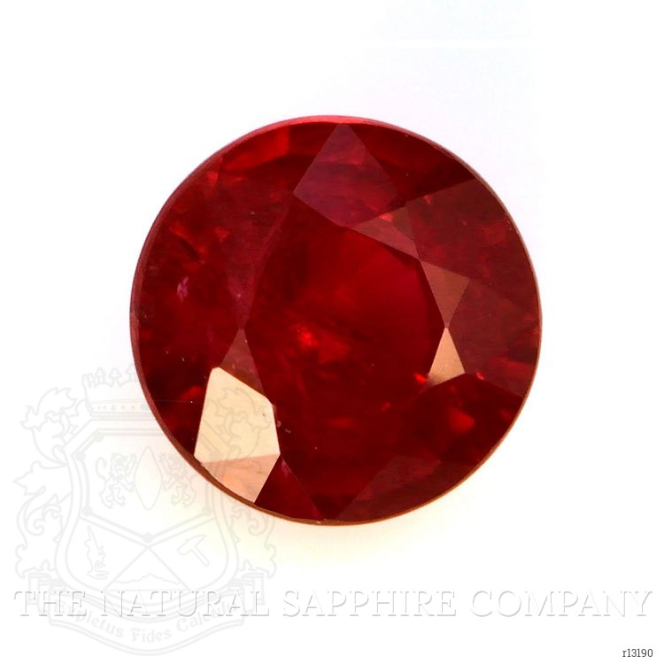 The ring features a beautiful, transparent 0.75 carat round shape red ruby with the dimensions of 5.36 x 5.26 x 3.27 mm and a mixed brilliant cut. It has a clarity grade of very slightly included (evaluated at eye level), vivid color saturation, and an excellent polish. The origin of this ruby is Mozambique.