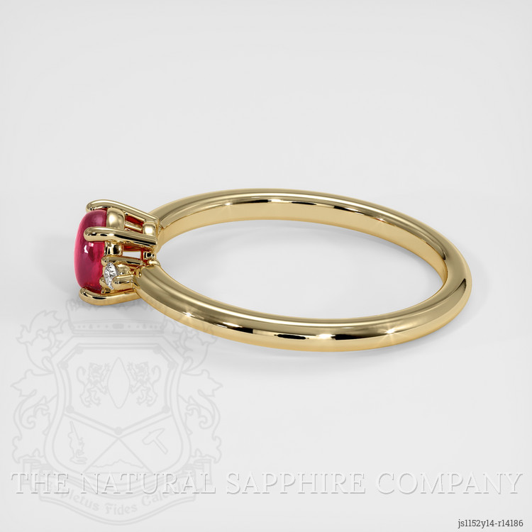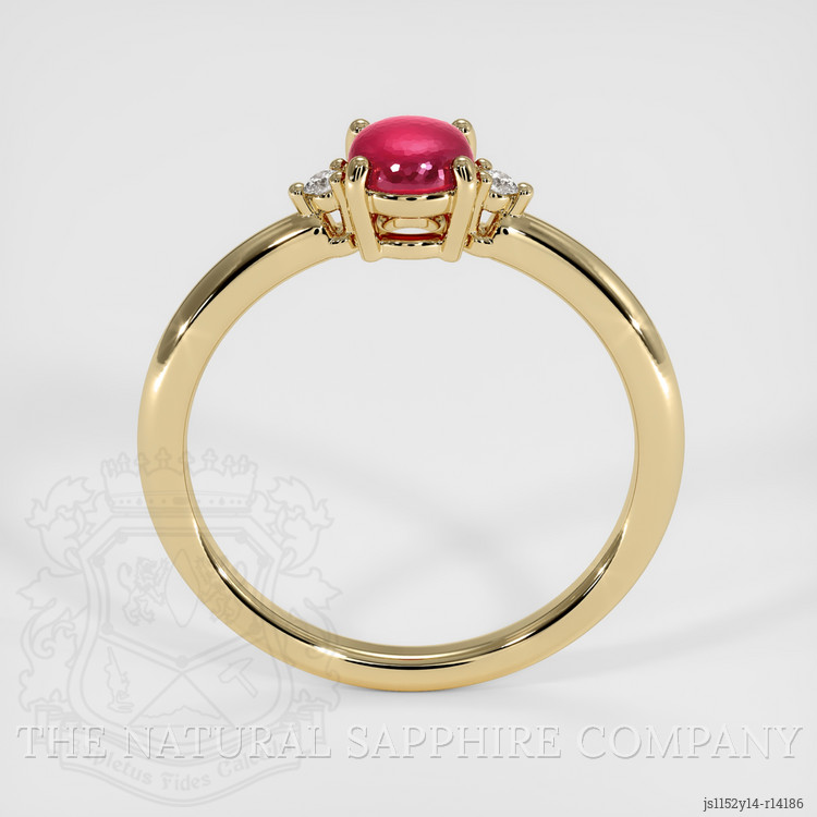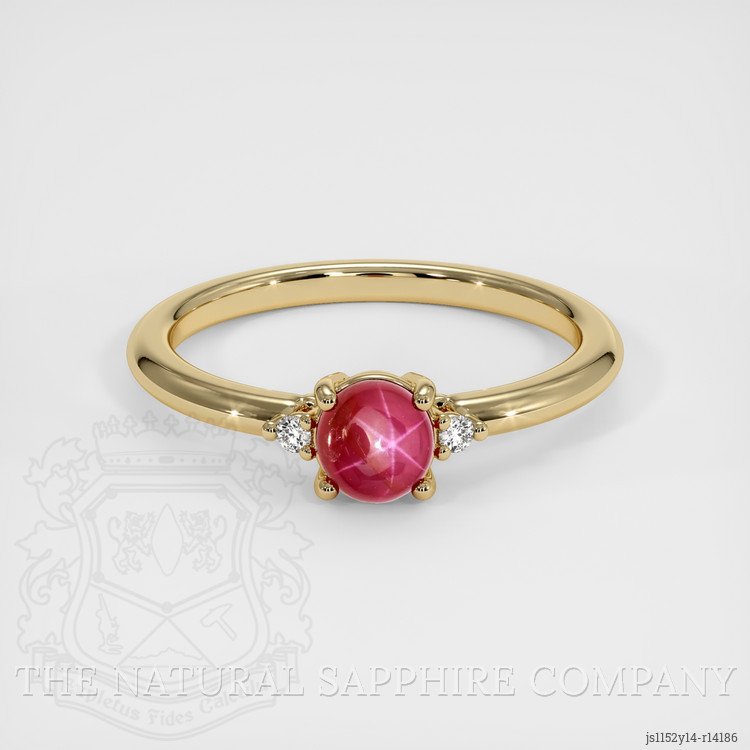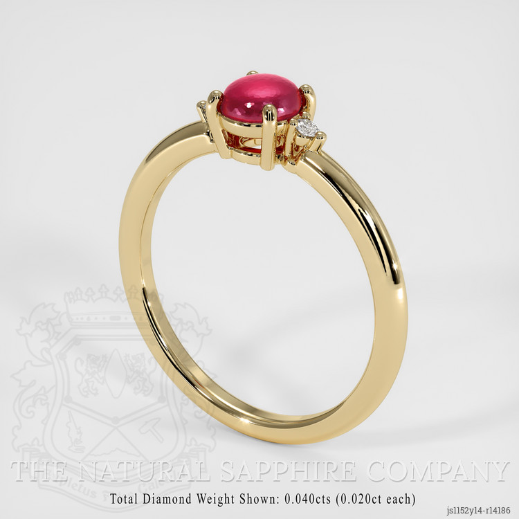 This exquisite ring is a true masterpiece of design, inspired by the elegance and grandeur of nature and architecture. At its heart lies a semi-translucent 0.94-carat round ruby, its dimensions precisely set at 5.52 by 5.27 by 2.72 millimeters, with a cabochon cut that enhances its organic beauty. This ruby, with its origin in Mozambique, captivates with its intense color saturation and excellent polish, reflecting a clarity grade of very slightly included when seen with the naked eye. Framing this rare gemstone are white, round-shaped diamonds, weighing approximately 0.04 carats, each possessing the refined clarity of VS1 to VS2, accompanied by a prestigious color grade of F. These jewels are all meticulously set within a 14K yellow gold band, adding warmth and richness to the design. Each element of the ring speaks to a narrative of rarity and exclusivity, offering the wearer a sense of belonging to an elite group who appreciates the combination of natural beauty and architectural sophistication found in this unique piece.