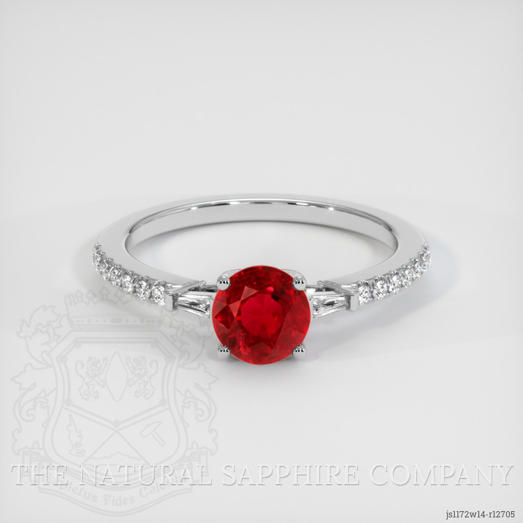 The ring features a beautiful, transparent 1.38 carat round shape red ruby with the dimensions of 6.22 x 6.15 x 4.22 mm and a mixed brilliant cut. It has a clarity grade of very slightly included (evaluated at eye level), vivid color saturation, and an excellent polish. The origin of this ruby is Mozambique.
