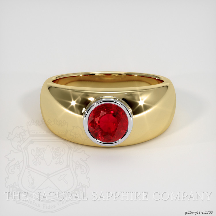 The men's ring features a beautiful, transparent 1.38 carat round shape red ruby with the dimensions of 6.22 x 6.15 x 4.22 mm and a mixed brilliant cut. This exquisite ruby boasts a clarity grade of very slightly included (evaluated at eye level), vivid color saturation, and an excellent polish. What sets this gemstone apart is its natural beauty, which requires minimal enhancement, unlike many others on the market that often undergo various treatments to improve their appearance. Sourced from the renowned deposits of Mozambique, this ruby's origin adds to its uniqueness and value.