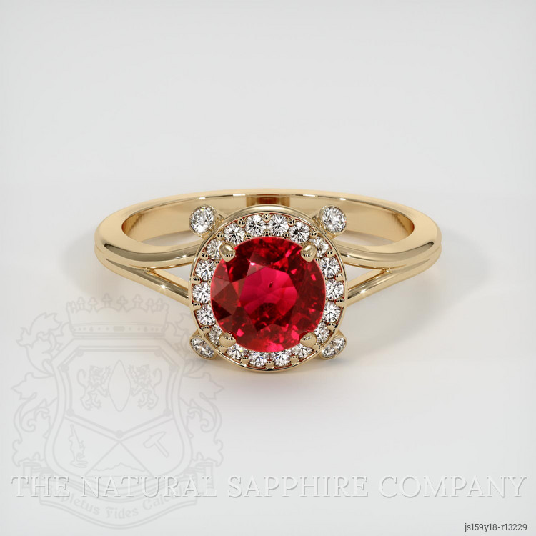 The ring features a beautiful, transparent Other certified Intense Red 1.39 carat round shape pinkish red ruby with the dimensions of 6.04 x 5.97 x 4.46 mm and a mixed brilliant cut. It has a clarity grade of slightly included (evaluated at eye level), vivid color saturation, and an excellent polish. The origin of this ruby is Mozambique.