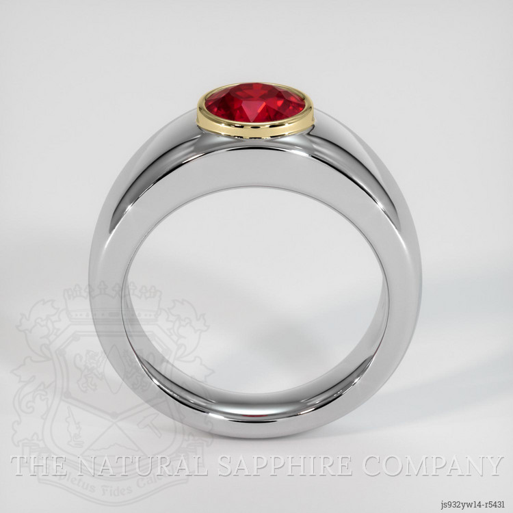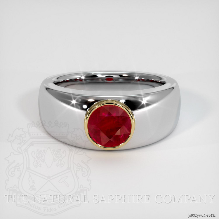 The men's ring showcases a magnificent transparent 1.49 carat red ruby renowned for its exquisite craftsmanship. The ruby features a precise round shape measuring 6.87 x 6.74 x 4.19 mm. With a mixed brilliant cut, the stone exudes a striking brilliance, a testament to the skilled artistry behind its faceting style. The clarity grade, very slightly included when evaluated at eye level, underscores the high standards of quality adhered to in selecting this gemstone. Further enhancing its allure is the vivid color saturation that brings out the ruby's natural beauty. This impressive ruby hails from Burma, Myanmar, a region respected for its exceptional gemstones. The ring is masterfully set in 18K yellow gold and 18K white gold, offering a sophisticated contrast that accentuates the richness of the ruby. The polished finish of the metalwork further complements the gemstone's luster, underscoring the exemplary craftsmanship and attention to detail. Serving as both an engagement and wedding piece, this ring holds profound significance. Its robust and elegant design appeals to knowledgeable buyers who appreciate the harmony between exceptional materials and impeccable design. As a symbol of commitment and enduring love, the ring's aesthetic and technical perfection make it an heirloom to be cherished for generations.