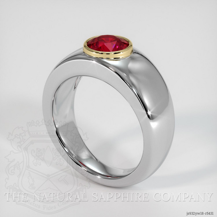 The men's ring showcases a magnificent transparent 1.49 carat red ruby renowned for its exquisite craftsmanship. The ruby features a precise round shape measuring 6.87 x 6.74 x 4.19 mm. With a mixed brilliant cut, the stone exudes a striking brilliance, a testament to the skilled artistry behind its faceting style. The clarity grade, very slightly included when evaluated at eye level, underscores the high standards of quality adhered to in selecting this gemstone. Further enhancing its allure is the vivid color saturation that brings out the ruby's natural beauty. This impressive ruby hails from Burma, Myanmar, a region respected for its exceptional gemstones. The ring is masterfully set in 18K yellow gold and 18K white gold, offering a sophisticated contrast that accentuates the richness of the ruby. The polished finish of the metalwork further complements the gemstone's luster, underscoring the exemplary craftsmanship and attention to detail. Serving as both an engagement and wedding piece, this ring holds profound significance. Its robust and elegant design appeals to knowledgeable buyers who appreciate the harmony between exceptional materials and impeccable design. As a symbol of commitment and enduring love, the ring's aesthetic and technical perfection make it an heirloom to be cherished for generations.